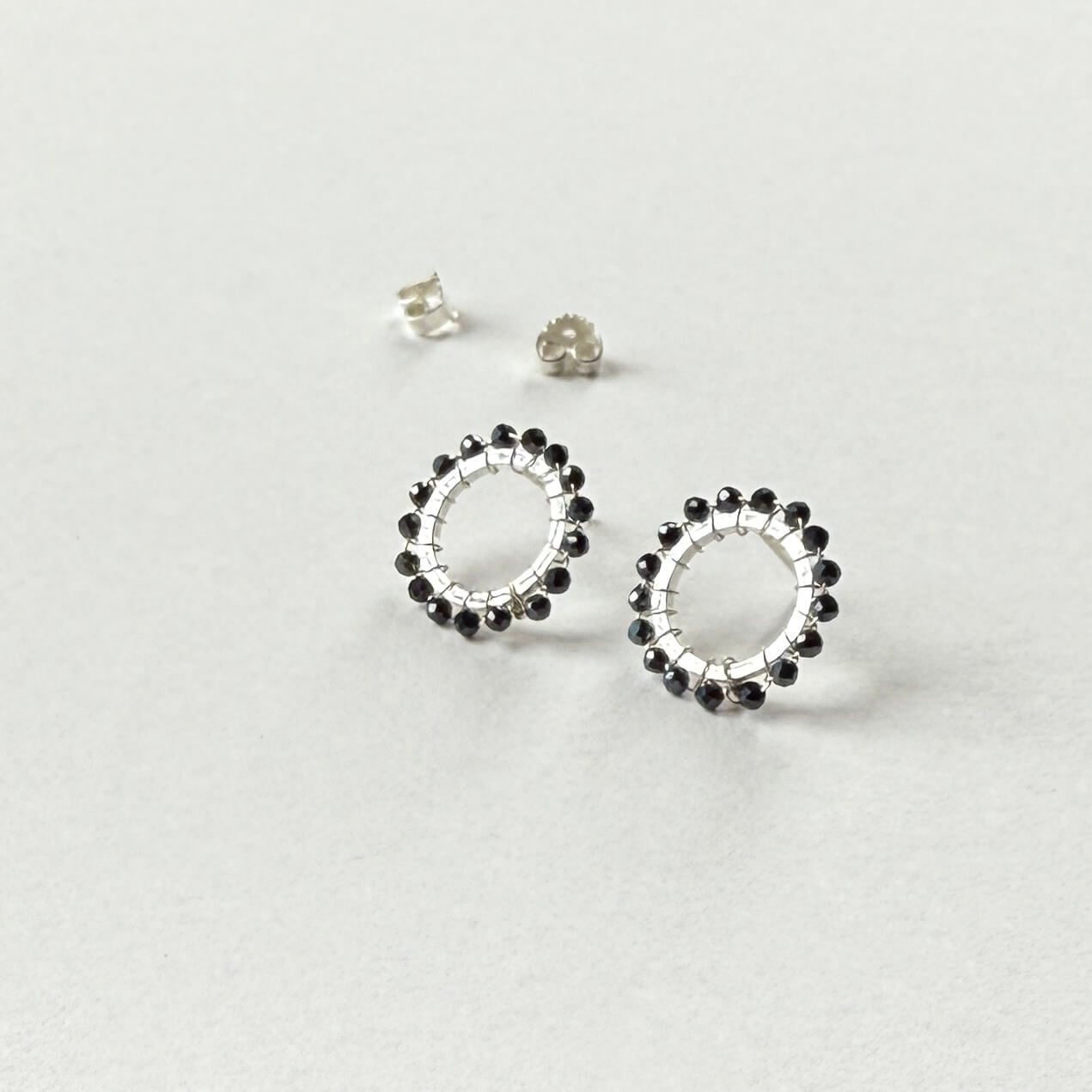 Gesmede zilveren cirkels met een rand van zwarte pyriet edelsteentjes.